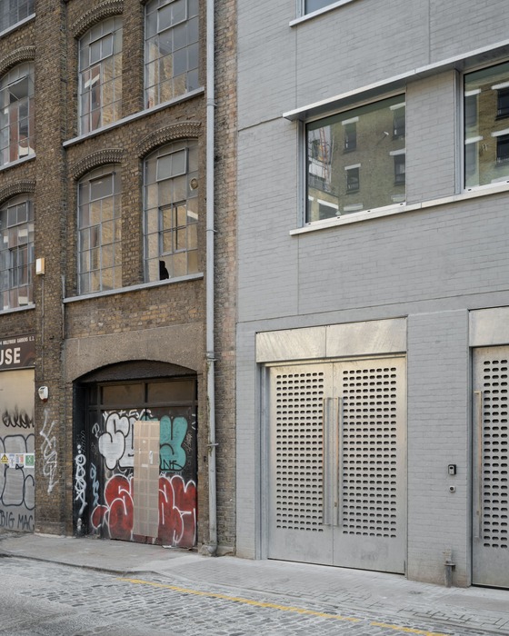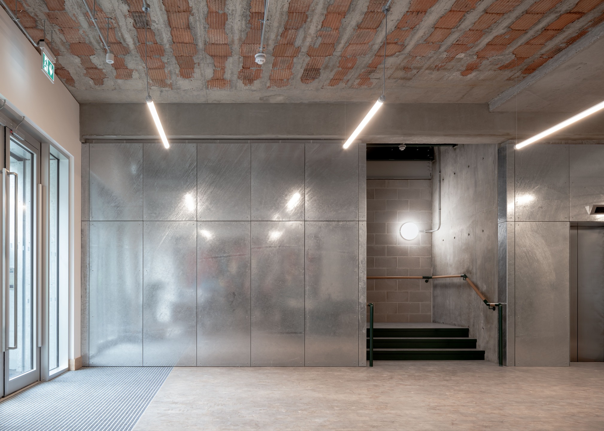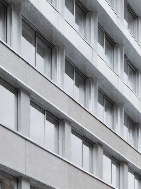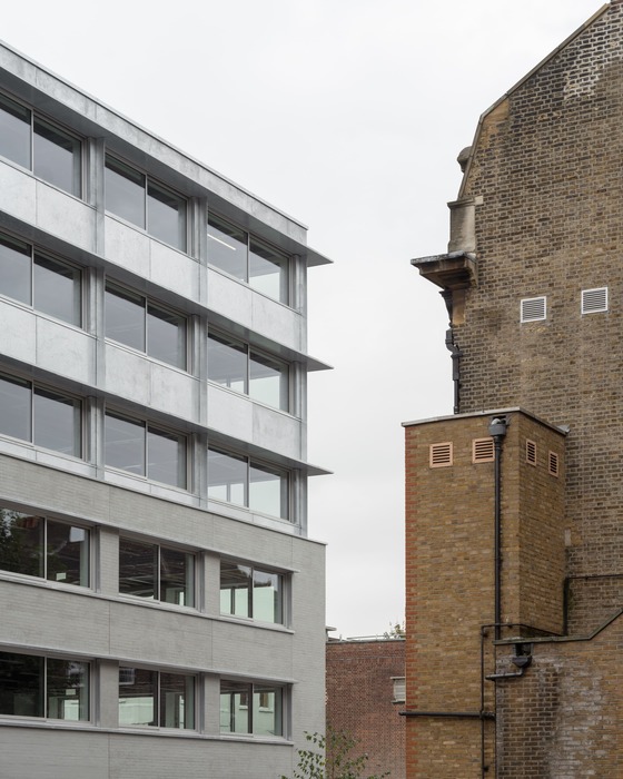 This thoughtful refurbishment maintains the building’s connection to its past, harmonizing the grey brickwork with the silvery sheen of the new cladding. The strategic contrast between the solid masonry base and the lightweight upper structure reinforces a sense of elegance and structural clarity.