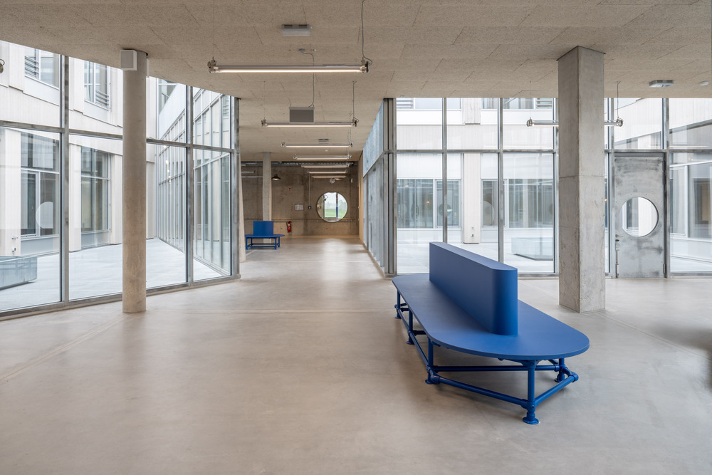 The building provides 120 workplaces, as well as a support centre for 24 people with significant care needs. Three distinct internal courtyards; circular, square and triangular, structure the building, drawing daylight deep into the interior and supporting wayfinding. A ring-shaped circulation route organises the different working areas and promotes permeability without creating unnecessary complexity. Large areas of glazing establish visual connections across levels, balancing clarity of layout with openness. The result is a working environment shaped by light, legibility and an intuitive spatial order.