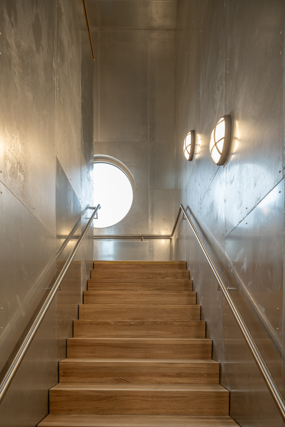 The pared-back material palette continues internally: fair-faced concrete, exposed services, light ceramic tiles, brushed stainless steel and selected timber linings create contrasts between technical clarity and a sense of warmth. Ancillary structures, including terrace frameworks, built-in furniture and external stair towers, were also fabricated from galvanized steel. Here, galvanizing is not treated solely as a technical process but as a design strategy that underpins the project’s visual identity and long-term performance.