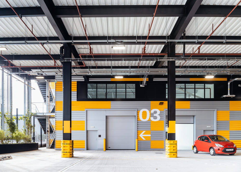 Architecturally, the scheme raises expectations for speculative industrial buildings. Full-height ‘shopfront’ glazing animates the ground floor, while a public café and business hub open the project to the street. Above, a rooftop breakout space offers tenants a place to meet, eat and socialise away from the working yard, a social layer rarely associated with industrial estates. Intelligent landscaping works hard on a dense site, using full-height green walls supported on galvanized frames, biodiverse margin habitats, native hedgerows and rain and shade gardens to deliver SUDS, visual relief and ecological value.