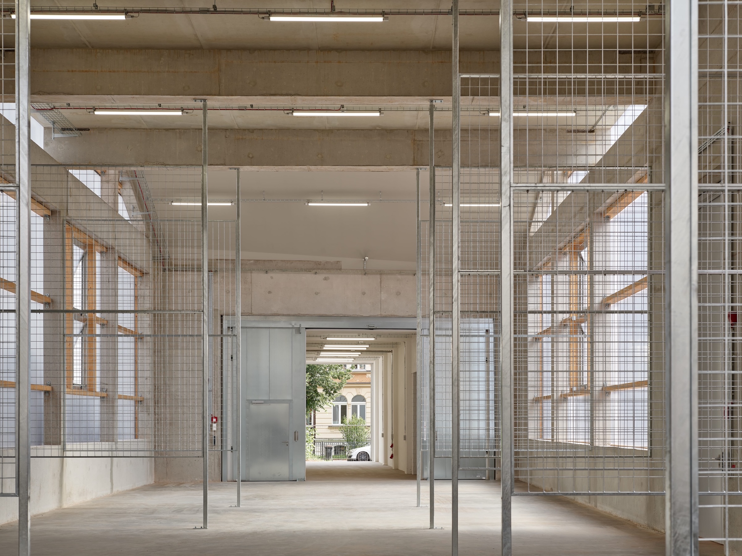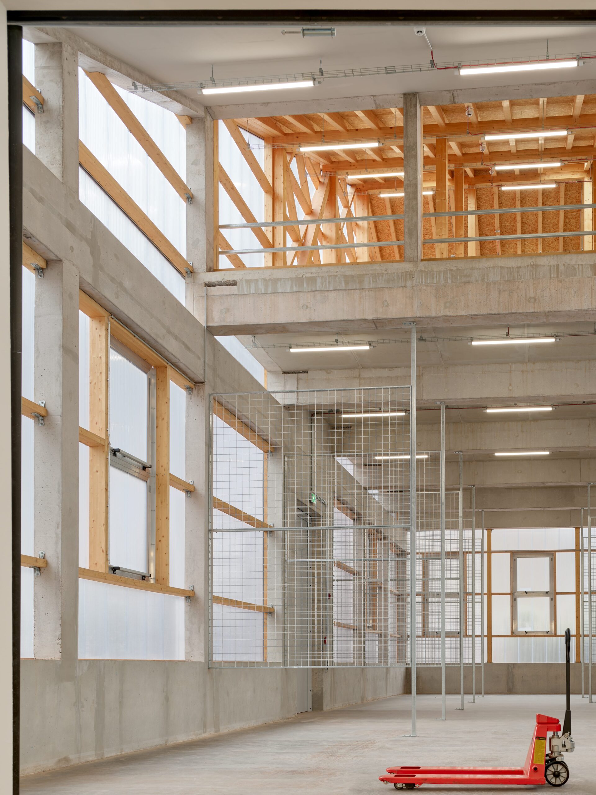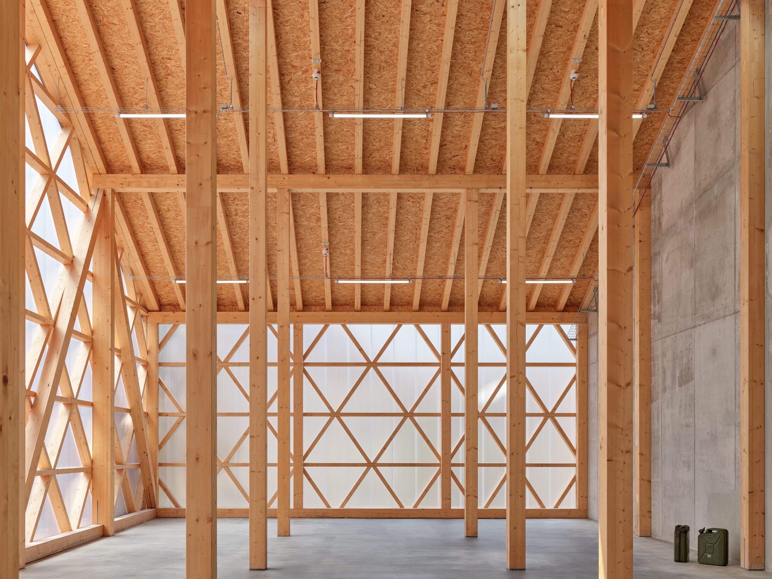 A sculptural extension for the props storage forms the project’s highlight, a seven-metre-high concrete and timber hall wrapped in translucent polycarbonate panels that bring daylight and transparency.